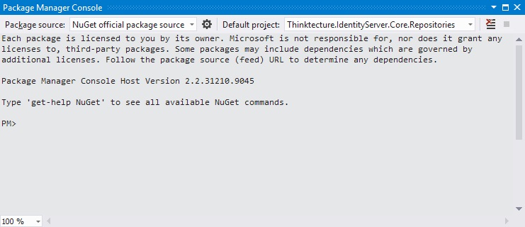 And this is what the console window looks like. You’ll need to pick the “Repository” project as the Default Project (notice the drop-down in the top right corner of the window):